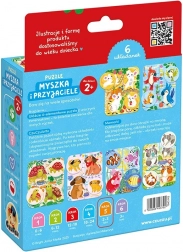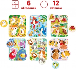 Urocze ilustracje ulubionych pupili – myszek, piesków, rybek, chomików, żółwi i papużek falistych – zachęcają do układania i pierwszej zabawy. Najpierw dzieci ułożą 6 czteroelementowych scen, następnie dopasują do nich 2 tematyczne żetony i zamienią puzzle w prostą grę na spostrzegawczość i dopasowywanie.