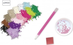 - Samoprzylepne płótno z folią ochronną, ok. 1350 kryształków w 14 kolorach, guma, długopis aplikacyjny, instrukcja w broszurze