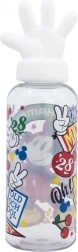 Plastowa butelka na picie z pięknym motywem Mickey Mouse i zakrętką w kształcie figurki 3D. Świetny wybór dla dzieci.