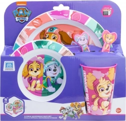 Uroczy i praktyczny dziecięcy zestaw obiadowy 5w1 z motywem PAW PATROL umili każdy posiłek dzięki kolorowemu nadrukowi. Zawiera talerzyk, miseczkę, łyżeczkę, widelec i kubek. Zestaw jest bez BPA, a kubek nadaje się do mikrofalówki (600 W / 2 min).