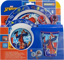 Pięcioczęściowy dziecięcy zestaw naczyń z ulubionym motywem SPIDERMAN marki STOR umili każdy posiłek. Zawiera talerz, miskę, kubek, łyżeczkę i widelec, jest bez BPA, a do kuchenki mikrofalowej nadaje się wyłącznie kubek (maks. 600 W przez 2 minuty).