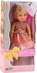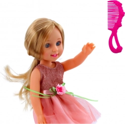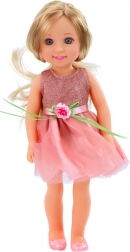 Lalka ubrana jest w przepiękną, błyszczącą sukienkę z tiulową spódnicą, ozdobioną delikatnym kwiatkiem i zieloną wstążką, co podkreśla jej dziewczęcy charakter. Całość uzupełniają różowe buciki, idealnie dopasowane do sukienki. Ruchome ręce i nogi sprawiają, że lalka jest nie tylko atrakcyjna wizualnie, ale też bardzo funkcjonalna podczas zabawy – można ją swobodnie ustawiać, sadzać lub „tańczyć” w wymyślonych scenkach.