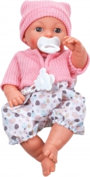 Lalka jest ubrana w uroczy komplet – miękki różowy sweterek, czapkę z uszami i wzorzyste spodnie. Ubranie można zdjąć, co pozwala dziecku przebrać lalkę i bardziej personalizować zabawę. Dodatkowym atutem są efekty dźwiękowe – lalka wydaje realistyczne dźwięki dziecka, takie jak śmiech, gaworzenie i płacz. To sprawia, że zabawa jest bardziej angażująca, dynamiczna i rozwija nie tylko wyobraźnię, ale także empatię i umiejętności opiekuńcze.
