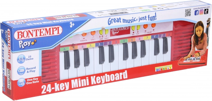 Bontempi Elektroniczne mini klawisze 24 klawisze przynoszą zabawę i interaktywność. Zawierają różne melodie i przydatne funkcje dla każdego małego muzyka.