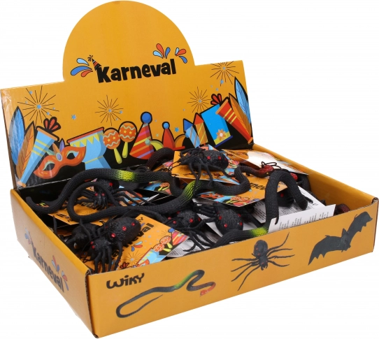 Gumowe figurki wąż, nietoperz i pająk w miksie. 50 szt. w display boxie – idealne jako nagrody, na dziecięce przyjęcia i Halloween. Miękkie i zabawne.