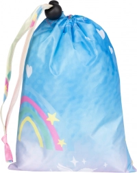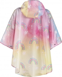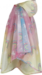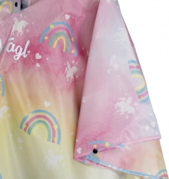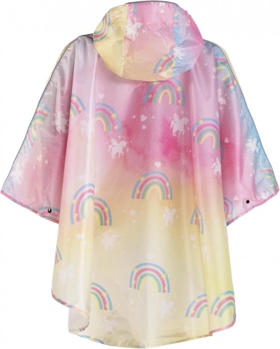 Stylowe dziecięce ponczo przeciwdeszczowe z kapturem z daszkiem w magicznym wzorze jednorożców i tęczy. Lekki, nieprzemakalny materiał, elementy odblaskowe dla bezpieczeństwa oraz krój do noszenia na plecak lub tornister sprawiają, że peleryna to idealny wybór do szkoły i na wycieczki. W zestawie praktyczny worek ze ściągaczem w dopasowanym wzorze.