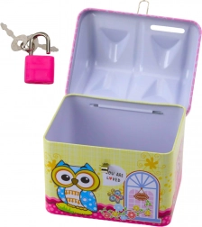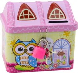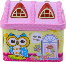 Skarbonka w kształcie domku z motywem sowy w pastelowych kolorach przypadnie do gustu każdemu dziecku.
