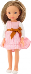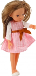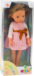 Lalka Pretty Girl to prawdziwa atrakcja dla każdej dziewczynki dzięki pięknie wymodelowanej twarzy z delikatnym uśmiechem i dużymi oczami. Ma miękkie, przyjemne w dotyku włosy, które można czesać i stylizować. Ubrana jest w różową sukienkę w białe paski, uzupełnioną białymi rękawami i ozdobną brązową kokardą w pasie. Tę elegancką stylizację dopełniają klasyczne białe buciki. Ubranko można zdejmować, co umożliwia zabawę w przebieranie i tworzenie własnych modowych kreacji.