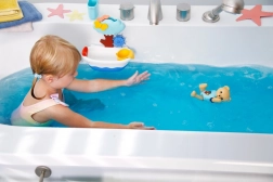 Miś Teddy o gładkich kształtach jest bezpieczny dla najmłodszych, łatwy do chwytania i świetnie unosi się na wodzie. Kolorowe elementy rozwijają małą motorykę, percepcję sensoryczną i logikę podczas odkrywania przepływu wody.