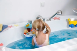 Łatwo przymocuj bazę do gładkiej powierzchni wanny lub ścianki prysznicowej. Zabawka trzyma się stabilnie i jest zawsze pod ręką.