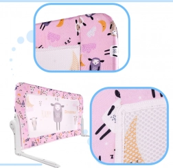 Montaż jest szybki i bez wiercenia – nóżki wystarczy wsunąć pod materac. Delikatny różowy design z motywem owieczek pasuje do większości wnętrz i ociepla dziecięcy pokój. Barierka jest idealna na czas przejścia z łóżeczka do dużego łóżka i pomaga rodzicom oraz dzieciom spać spokojniej i bezpieczniej.