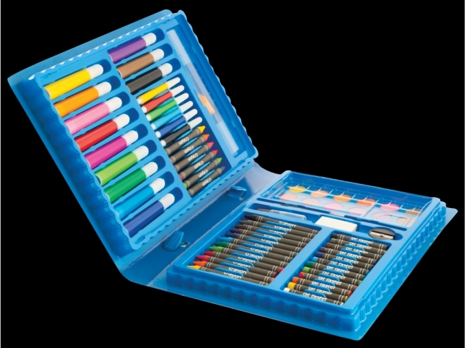 - 80 sztuk przyborów: akwarele, flamastry, kredki woskowe, kredki ołówkowe i akcesoria