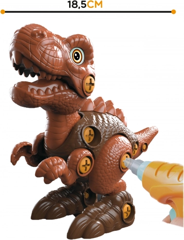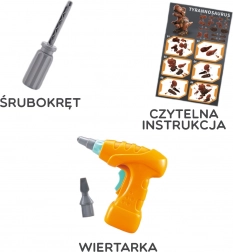 W zestawie znajduje się elektryczna wiertarka z funkcją dokręcania i odkręcania śrub – dzieci łatwo złożą i rozłożą swojego T‑Rexa.