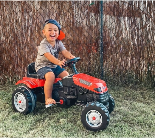 Dla maksymalnego komfortu traktor posiada 6‑stopniowo regulowane siedzisko (przód–tył), klakson na kierownicy oraz napęd łańcuchowy na tylne koło dla płynnego działania. Przednia skrętna oś ułatwia manewrowanie, a hak holowniczy pozwala podłączyć przyczepkę lub inne akcesoria, zapewniając jeszcze więcej scenariuszy zabawy.