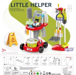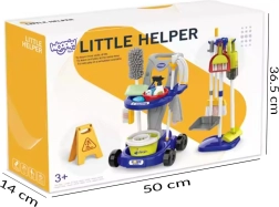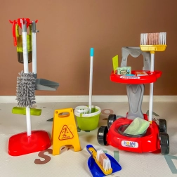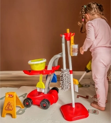 W zestawie znajduje się wszystko, co potrzebne: wózek na kółkach, mop, miotła i zmiotka z szufelką, widło, spryskiwacz, ściereczki, tabliczka ostrzegawcza „Uwaga, śliska podłoga” oraz inne dodatki. Liczba elementów zapewni dzieciom godziny zabawy i wesprze odgrywanie ról oraz współpracę z rodzeństwem.
