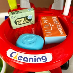Jeżdżący czerwony wózek utrzymuje wszystkie narzędzia razem, a dzieci wygodnie przewiozą je tam, gdzie „sprzątają”. Uczy systematyczności i organizacji.