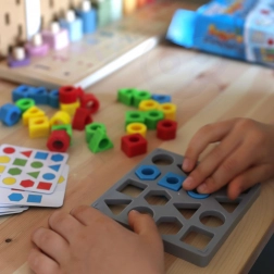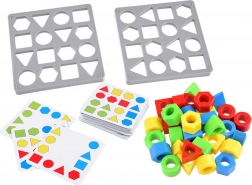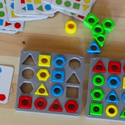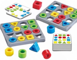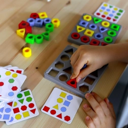 Zasady gry: Gracze muszą ułożyć wzór na podstawie zgodnie z wylosowaną kartą. Należy zachować zarówno układ, jak i kolory kształtów geometrycznych.