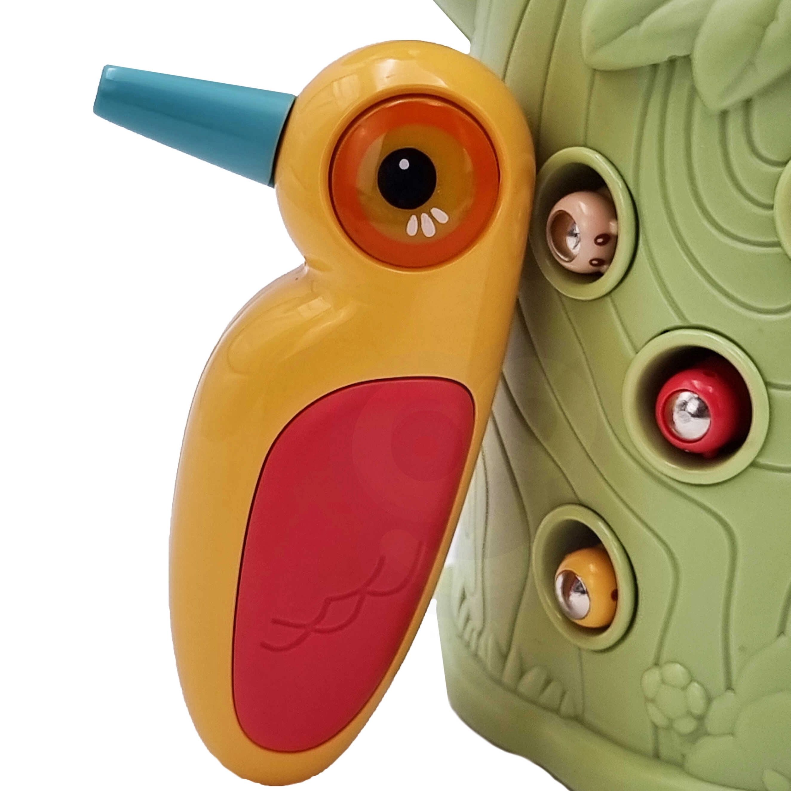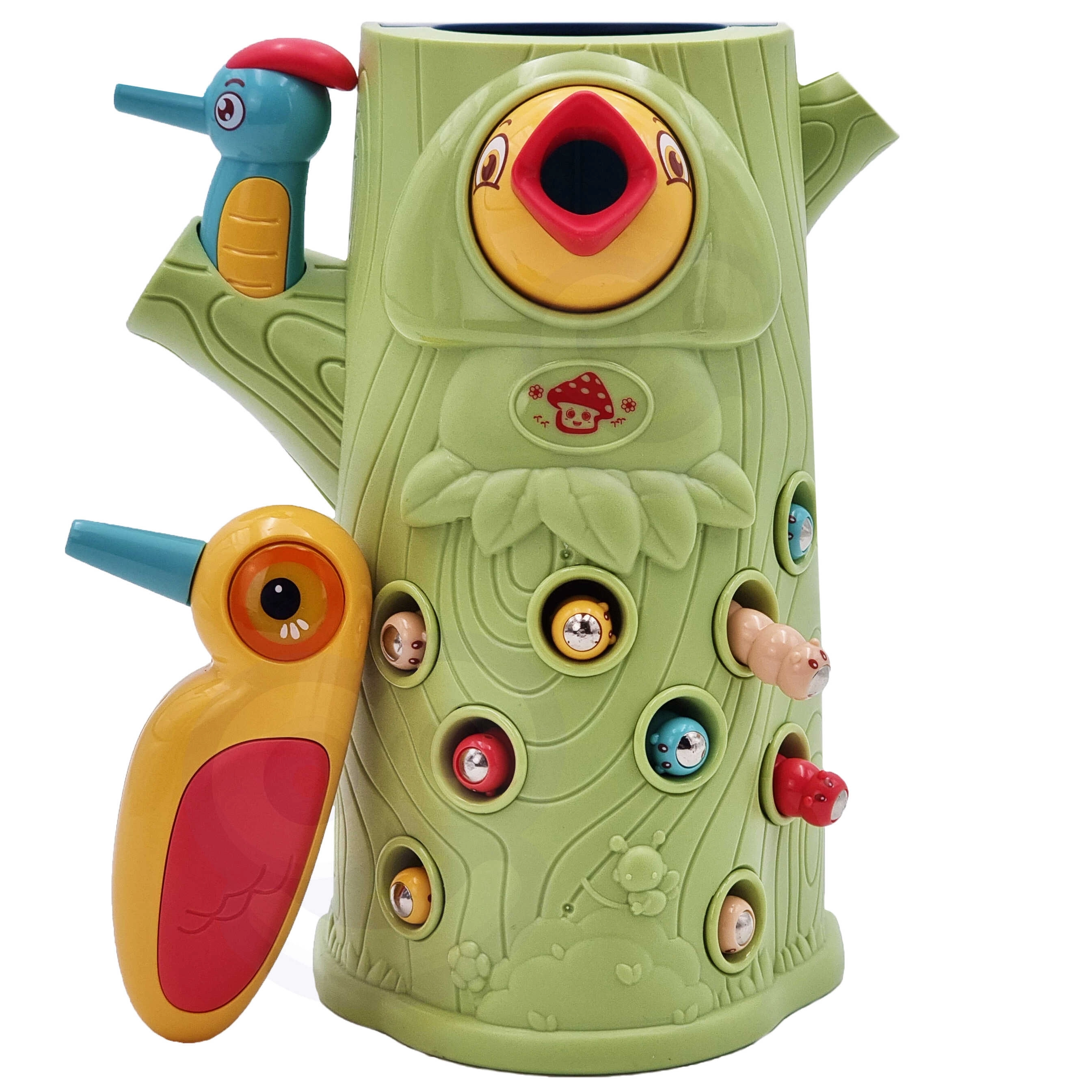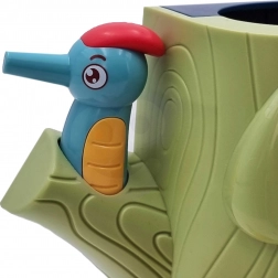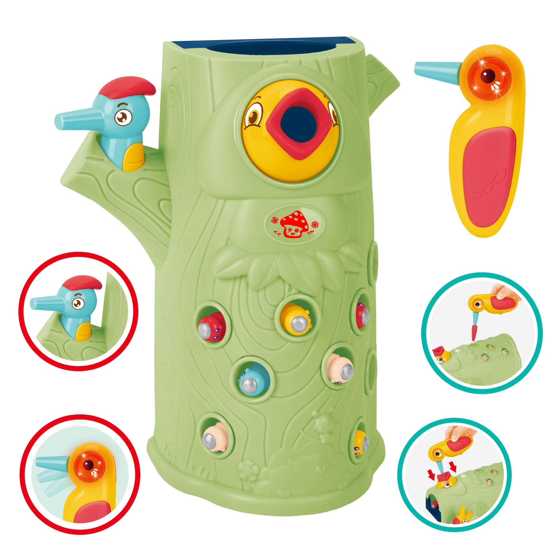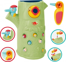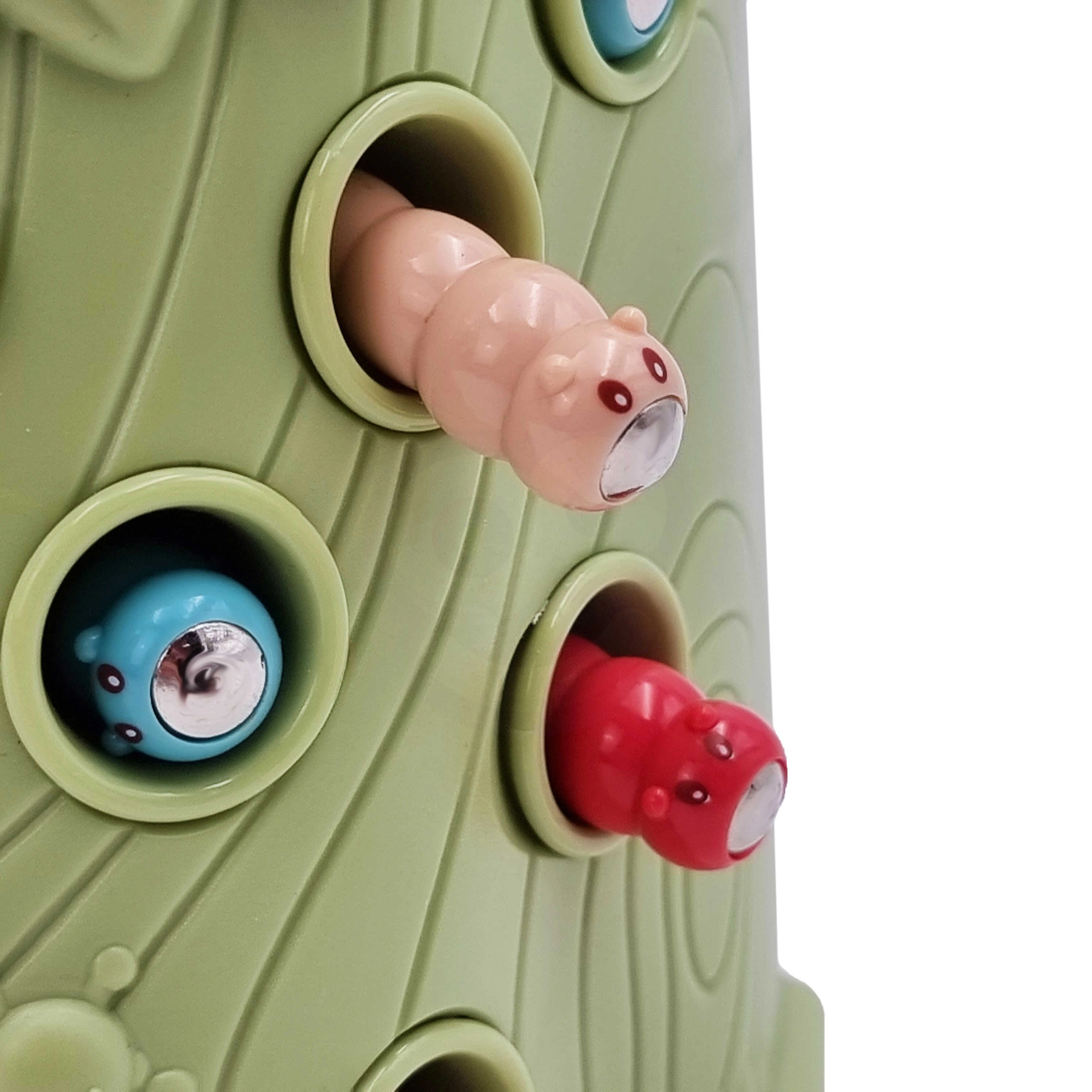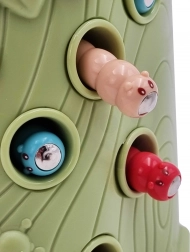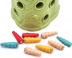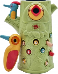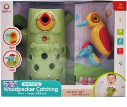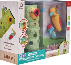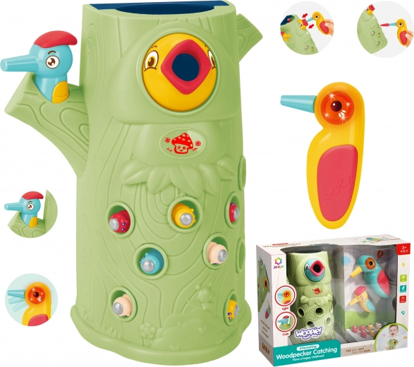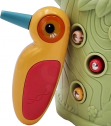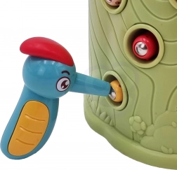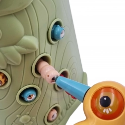 Gra zręcznościowa Złap chrabąszcza marki Woopie to świetny sposób na spędzanie czasu z Twoim dzieckiem. Proste zasady i intuicyjna obsługa umożliwiają rozgrywkę niemal dla każdego. Celem gry jest łapanie chrabąszczy dzięciołem z magnesem, który wyciąga je z otworów w pniu, a następnie ich wkładanie do dzioba ptaka. W zestawie znajdziesz oprócz dwóch dzięciołów do karmienia pisklęcia i pnia z piszczałką także 9 chrabąszczy. Większy dzięcioł ma dodatkowe funkcje: świeci, porusza dziobem oraz wydaje dźwięki i melodie. Wystarczy nacisnąć trzonek, a oko dzięcioła się zaświeci i uruchomi się wesoła kołysząca melodia, ptak może także poruszyć dziobem w dół, a jego oko świeci podczas ćwierkania. Z zabawki mogą korzystać jednocześnie dwoje dzieci. Dzięki grze dzieci uczą się poprzez zabawę – pomaga rozwijać m.in. motoryczne (ruchowe) i wizualne umiejętności. Gra stanowi wyzwanie, wymaga koncentracji i zręczności manualnej, czym angażuje dzieci.