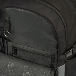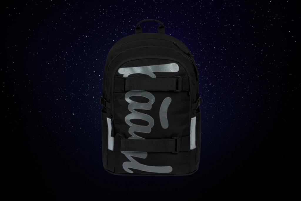 Materiał zewnętrzny jest recyklowany i wodoodporny, dzięki czemu plecak niezawodnie sprosta zmiennej pogodzie. O bezpieczeństwo dbają wyraźne elementy odblaskowe poprawiające widoczność o zmierzchu i w nocy. Nie brakuje bocznych kieszeni z wytrzymałego materiału na butelkę z napojem, odpornych zamków YKK oraz przednich pasków do zamocowania deskorolki. Plecak można także skompletować z piórnikiem, workiem na obuwie i innymi akcesoriami w tym samym wzorze; w zestawie znajduje się również stylowa zawieszka.