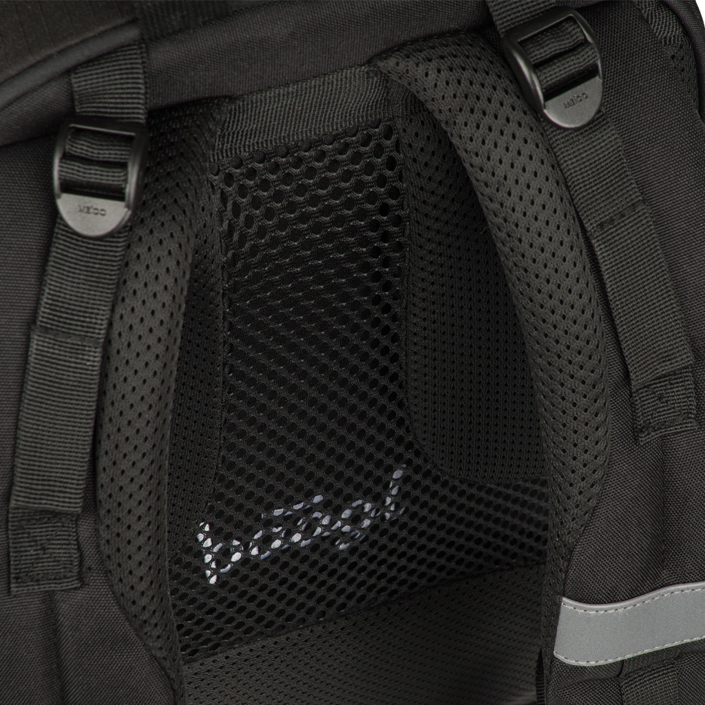 Anatomicznie profilowana część tylna z wzmocnieniem lędźwiowym oraz w pełni regulowane szelki zapewniają prawidłowe ułożenie plecaka i całodzienny komfort nawet przy większym obciążeniu.
