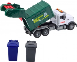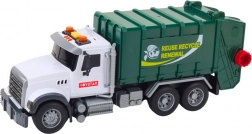 Realistyczna śmieciarka w skali 1:14 ze świetlnymi i dźwiękowymi efektami, ruchomymi elementami oraz dwoma koszami do segregacji odpadów. Solidne wykonanie z plastiku, baterie w zestawie i proste sterowanie przyciskami na dachu gwarantują długą i bezpieczną zabawę.