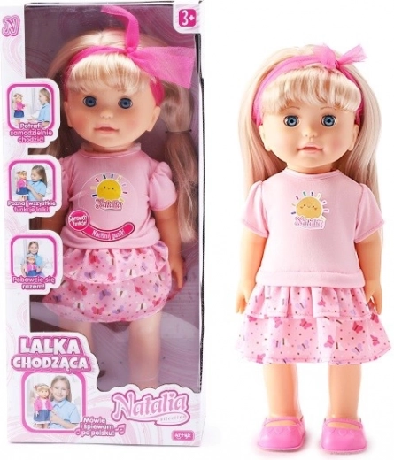 Odkryj magię zabawy z lalką NATALIA o wysokości 40 cm, która po podwójnym klaśnięciu zaczyna chodzić, po naciśnięciu brzuszka śpiewa i mówi, a dzięki zamykającym się oczom wygląda jeszcze bardziej realistycznie. Idealny prezent rozwijający wyobraźnię i zapewniający interaktywną zabawę.