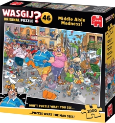 Puzzle JUMBO WASGIJ 46: Szaleństwo środkowej uliczki wywracają tradycyjne układanie do góry nogami. Zamiast obrazka z pudełka układasz scenę z perspektywy wybranej postaci, którą odkrywasz dzięki wskazówkom i podpowiedziom na opakowaniu. Dzięki temu każde układanie jest inne, emocjonujące i niezwykle zabawne.