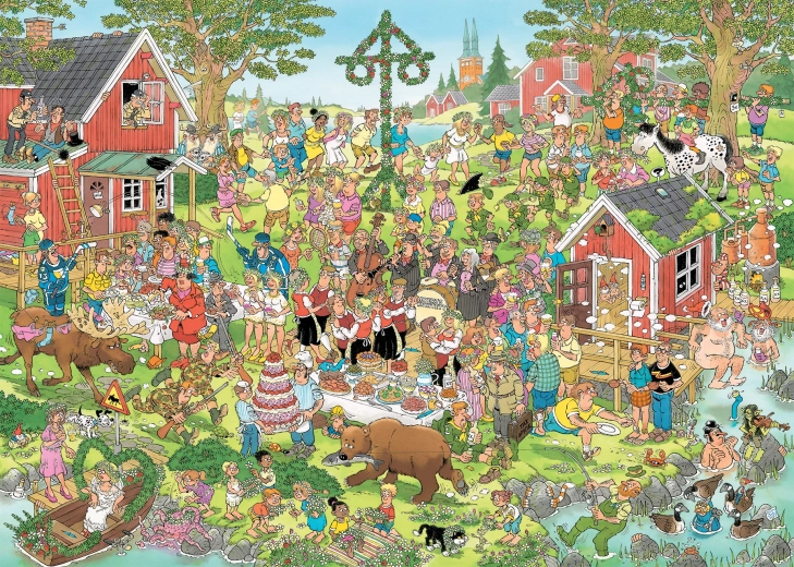 Popularne puzzle z serii Jan van Haasteren zabiorą Cię na szalony letni festiwal, gdzie ciągle coś się dzieje. Typowy kreskówkowy styl pełen postaci, zabawnych sytuacji i pomysłowych detali gwarantuje, że podczas układania nie będziesz się nudzić. Każdy element idealnie pasuje na swoje miejsce, odsłaniając barwną scenę pełną energii.