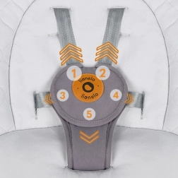 Szerokie, ergonomicznie wyprofilowane siedzisko, 5‑punktowe pasy z miękkimi osłonkami oraz odpinana pałąk‑zabawka. Pokrowiec można prać ręcznie w 30 °C.