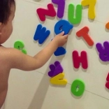 Dziecko podczas kąpieli poznaje alfabet i cyfry, co przyczynia się do edukacji poprzez zabawę.