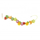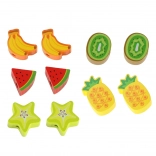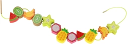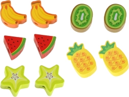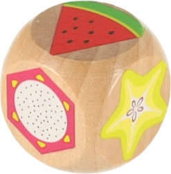 - 12 drewnianych owoców + kostka + jeżyk + sznurek
