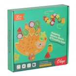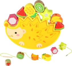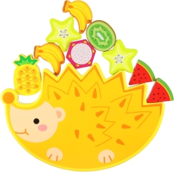 Uroczy drewniany jeżyk z kolorowymi owocowymi klockami oferuje dwie gry w jednej: nawlekanie owoców na sznurek oraz balansowe układanie na grzbiecie jeżyka. Wspiera motorykę małą, logiczne myślenie i koordynację ręka–oko. Wysokiej jakości gładko szlifowane drewno i nasycone kolory zachęcają do długiej i wartościowej zabawy.