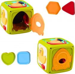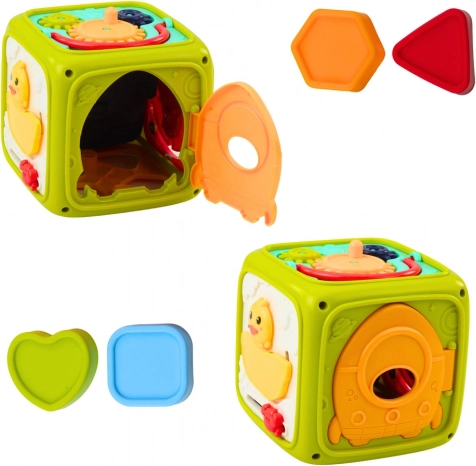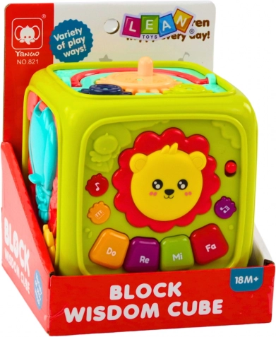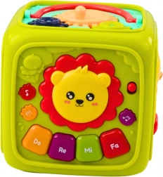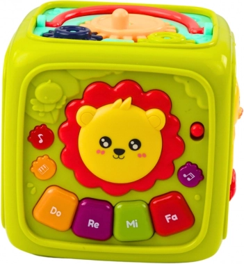 Interaktywna kostka zawiera elementy muzyczne, takie jak klawisze z melodiami oraz przyjaznego lwa, który zachęca do interakcji. Znajdziesz tu także segregator kształtów, ruchome drzwiczki, elementy obrotowe i wesołe grafiki ze zwierzątkami. Zabawka odtwarza dźwięki i piosenki, które stymulują zmysły i rozwój słuchu u najmłodszych.