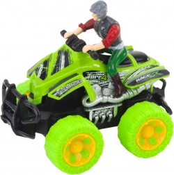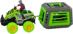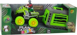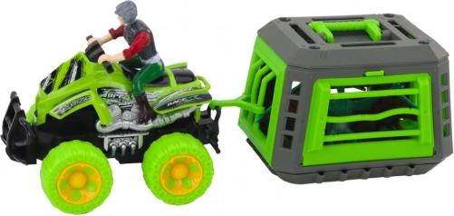 W zestawie znajduje się nie tylko solidny quad z doczepianą klatką, ale także figurka kierowcy w kasku ochronnym oraz figurka dinozaura, które razem tworzą spójną scenkę gotową do zabawy od razu po rozpakowaniu.