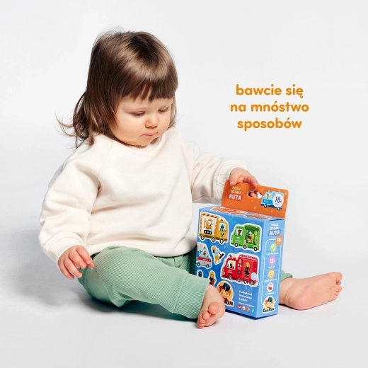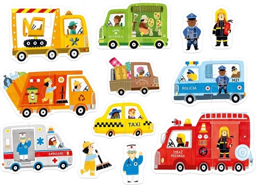 Zabawny zestaw pierwszych puzzli dla najmłodszych: 8 dwuelementowych obrazków kolorowych pojazdów oraz 4 figurki postaci dla jeszcze większej frajdy z zabawy. Rozwój motoryki małej, trening koncentracji i nauka nowych słów w jednej grze. Tradycyjne łączenie elementów ułatwia początki, a gotowe obrazki zachęcają do dalszych aktywności.