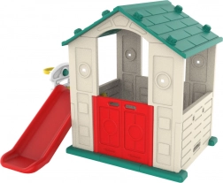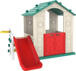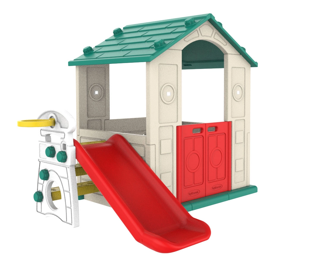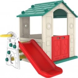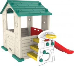 Dziecięcy domek ogrodowy zintegrowany ze zjeżdżalnią i koszem do koszykówki zapewnia dzieciom godziny zabawy i aktywności fizycznej na świeżym powietrzu.