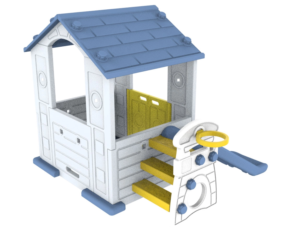 W skład domku wchodzi zestaw do koszykówki z obręczą i tablicą.