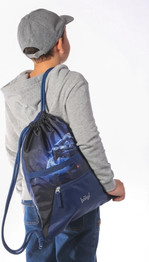 - Praktyczny worek z kieszenią na zamek z materiału zmywalnego, idealny na kapcie lub zajęcia pozalekcyjne.