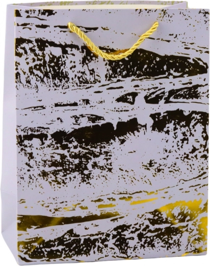 Ta elegancka i ponadczasowa torba upominkowa w srebrnym odcieniu z nieregularnym złotym wzorem jest stylowym opakowaniem, które samo w sobie przyciąga uwagę i podkreśla wyjątkowy charakter prezentu. Złote akcenty pięknie połyskują w świetle, co dodaje torbie luksusowy i nowoczesny wygląd, który z pewnością zwróci uwagę obdarowanej osoby.