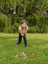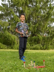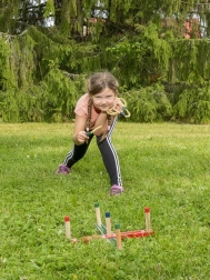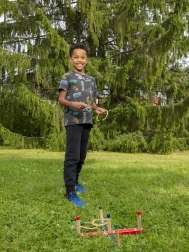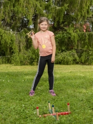 Dzięki wytrzymałemu drewnu i lekkim kółkom gra jest idealna dla dzieci i dorosłych. Łatwo ją przenieść i szybko przygotować do zabawy na trawniku, w ogrodzie, w parku czy na wakacjach.