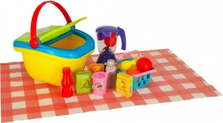- Kosz piknikowy z pokrywkami, plastikowe owoce, kartoniki z sokiem, buteleczki, kubek do shake’a, mata piknikowa, naklejki, instrukcja