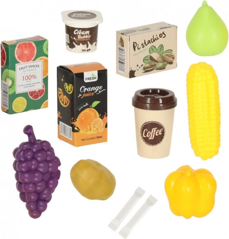 Zawiera 36 elementów, w tym owoce, warzywa, jogurty, napoje i inne artykuły, a także zabawkowy telefon i kolorowe naklejki. Ta bezpieczna i trwała zabawka została wykonana z myślą o bezpieczeństwie dzieci, bez ostrych krawędzi, i jest idealna do kreatywnych scenariuszy oraz realistycznych doświadczeń.