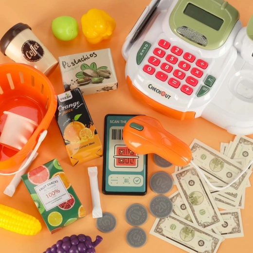 Dziecięca kasa dla małych sprzedawców z 36 akcesoriami, rozwijająca umiejętności społeczne, matematyczne i logiczne przez zabawę. Bezpieczna i trwała zabawka z realistycznymi elementami do odgrywania ról.