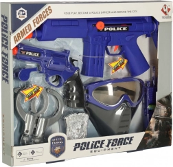 Ten zestaw zawiera podstawowe elementy policyjnego wyposażenia, w tym pistolet, karabin, kajdanki, maskę i inne akcesoria do realistycznej zabawy.