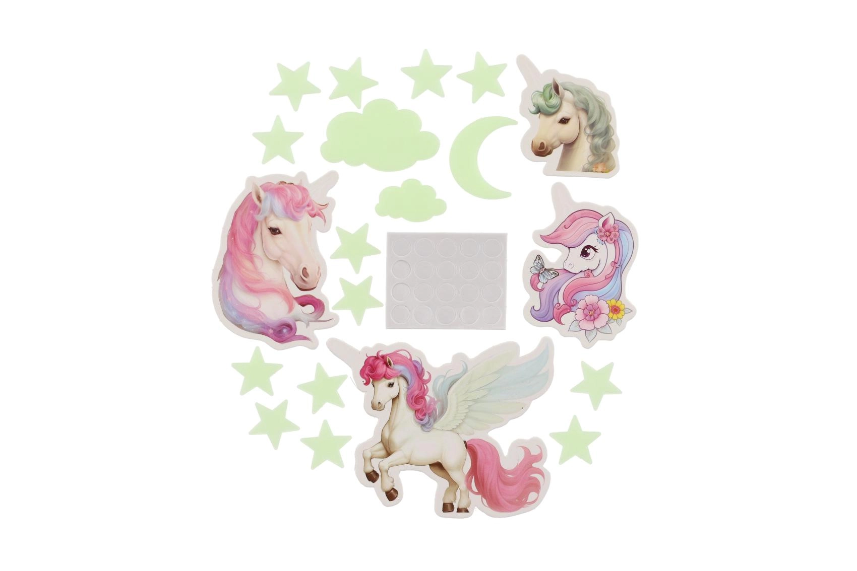 Stwórz dzieciom magiczny świat prosto w ich pokoju. Świecące jednorożce po naświetleniu rozbłysną i wyczarują subtelne światełko, które uspokaja i pomaga przy zasypianiu. Zestaw zawiera różne kształty i rozmiary jednorożców do kreatywnej dekoracji ścian i sufitu.