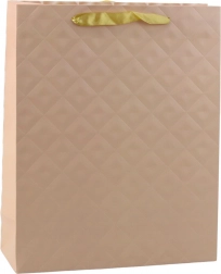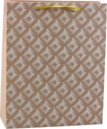 Torebka prezentowa wykonana jest z wysokiej jakości usztywnionego papieru, a jej powierzchnię zdobi tłoczony geometryczny wzór, który pięknie odbija światło. Dwie odmienne wersje frontu i tyłu sprawiają, że torebka wygląda stylowo z każdego kąta. Satynowe uchwyty w jasnym odcieniu nadają całości subtelny charakter i gwarantują wygodne przenoszenie.