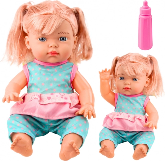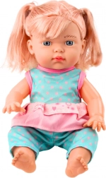 Lalka ubrana jest w jednoczęściowe, zdejmowane ubranko w turkusowym kolorze z różowymi kropkami i falbanką. Zestaw zawiera także butelkę, dzięki której dzieci mogą odgrywać sceny karmienia i opieki.