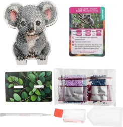 Ten kreatywny hobby wymaga staranności i cierpliwości, ale nagrodą jest piękny obrazek, który możesz dumnie wyeksponować. W zestawie znajduje się drewniana tabliczka w kształcie koali z nadrukowanym wzorem, drewniana podstawka, aplikator (piórko), miseczka, wosk klejący oraz zestaw kolorowych kamyczków.