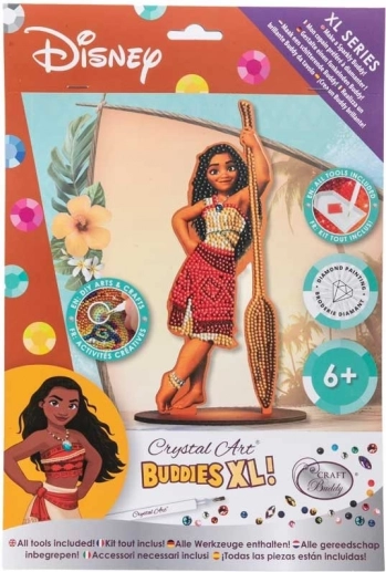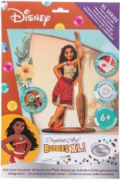 W zestawie znajduje się wszystko, czego potrzebujesz do wykonania obrazu: drewniana tablica w kształcie postaci Vaiany, drewniana podstawka, długopis do aplikacji kryształków, tacka, wosk oraz zestaw kolorowych kryształków. Produkt ma wymiary około 25 cm, dzięki czemu świetnie sprawdzi się jako dekoracja domu lub prezent dla miłośników kreatywnej zabawy.