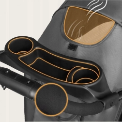 Miękka mata jest odporna na ścieranie i zabrudzenia, co zapewnia długotrwały komfort i łatwą pielęgnację. Duża przestrzeń bagażowa na dole wózka i praktyczna torba są idealne na wszystkie potrzebne rzeczy w podróży. Wózek wyposażony jest w koła z amortyzacją i hamulcem, które zapewniają płynną i bezpieczną jazdę.